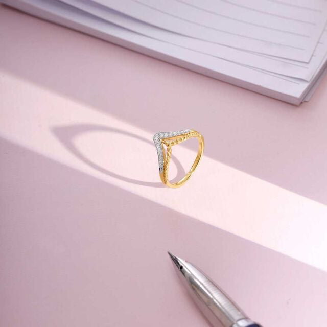 Opt for a ring featuring striking gold beadwork and natural diamonds on a sleek V curve pattern, exuding effortless glamour. The versatility of the ring makes it ideal for stacking or styling solo, shining brightly as a reminder of the love that continually develops with time.